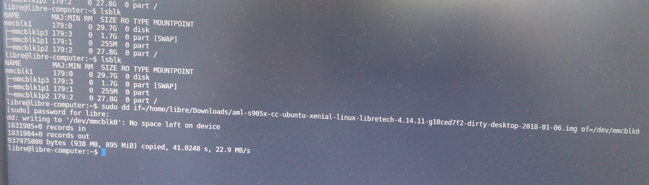 root@libre-computer:~# dd bs=4M if=LibreELEC-LePotato.arm-8.90.6.img of=/dev/mmcblk0